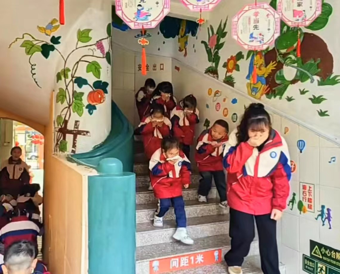 隨后,全園師生開展了消防安全預案演練。消防警報拉響后,孩子們在老師的帶領下有序撤離活動室,各崗位人員按照預案迅速各就各位,協助疏散孩子撤離到安全避險場所。孩子們用濕毛巾捂住口鼻,低下身子,沿墻角邊有秩序地撤離,教師引導孩子逃生時不搶道、不驚慌。整個演練活動緊張有序,用時3分鐘順利完成,師生共計138人次參與了此次演練活動。